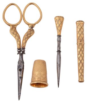 bearing French control marks, comprising a pair of scissors, a needle case, a thimble and a piercing tool, two items with steel elements, (4)
