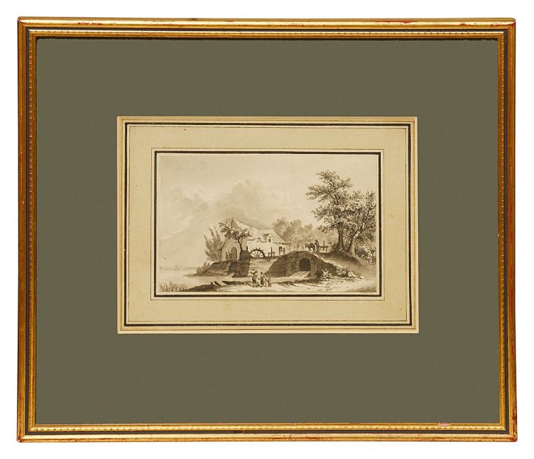 'The Watermill', ink and wash, framed and mounted, bearing inscription verso 'Richard Cuming of Camberwell Road, signed with monogram and dated 1790, Provenance: Paul Donovan., Cranbrook Gallery Fine Arts, Kent.'.