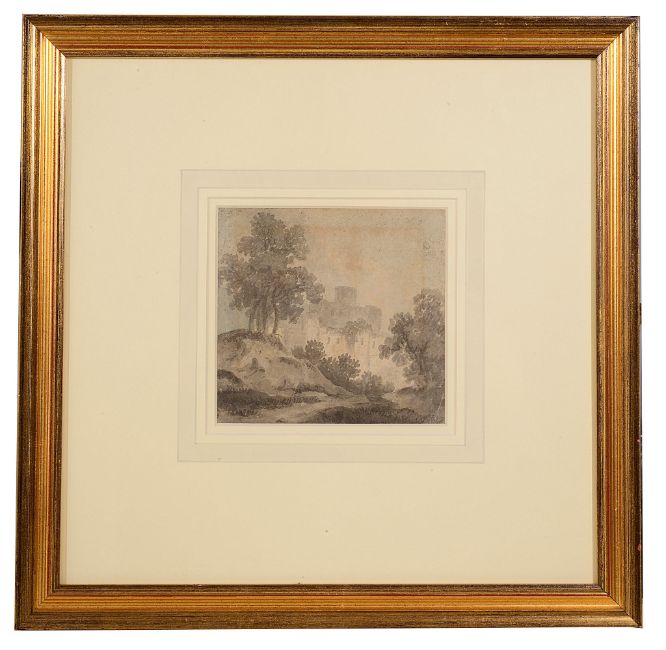 'A Country Path Leading to a Castle Ruin', pencil, ink and wash, framed and mounted, bearing modern inscribed label verso 'Monro School (1793-1833) A Country Path leading to a Castle ruin, pencil with blue and grey washes, .....circa 1794 - 1800, inscribed verso Gainsborough, Exhibited : Drawings & Watercolour Fair, Park Lane Hotel, London, 2001. Provenance : Cardiff & Rayner Fine Art.'