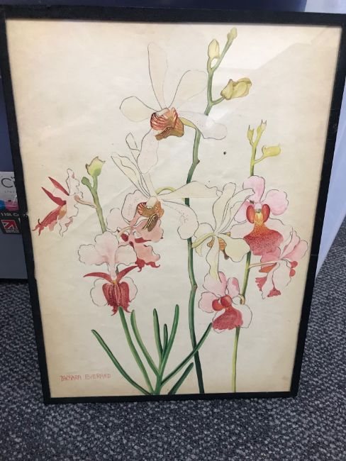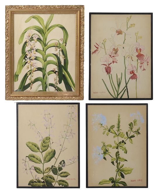 watercolour, three signed lower right in red, narrow black edged glazed frames, and the fourth example glazed in a gilt gesso frame, titled in pencil top right, 'Airedes Rhohaninom', signed lower left, (4)