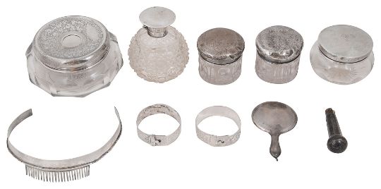An Edwardian silver topped cut glass scent bottle, silver topped glass jars and other items