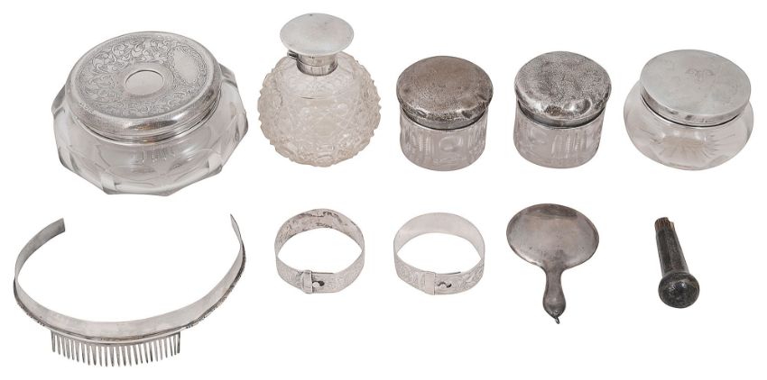 Condition:Dings to scent bottle cap, occasional fleabite to body, Pair silver topped jars have dings and knocks