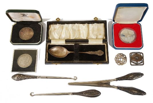 in Royal Mint box, together with a National Trust silver medal, boxed, and an American Morgan silver dollar, 1884, a large silver tea spoon, Birmingham, 1948, two silver brooches, two silver handled button hooks, one Birmingham and a silver handled pair of glove stretchers, Birmingham, (9)