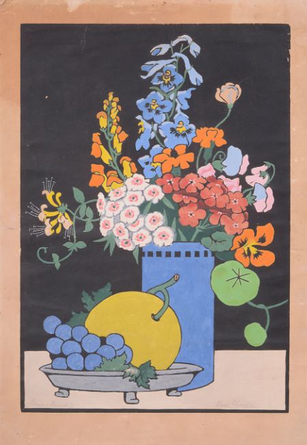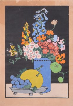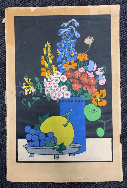 'Flowers and Fruit' still life, coloured woodblock, signed and titled in pencil to lower margin