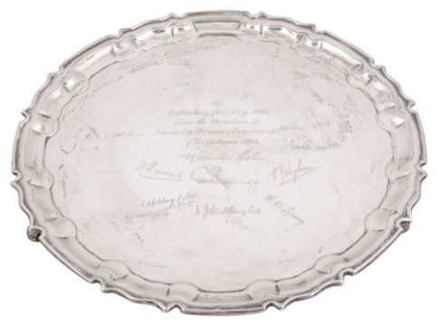 oval with raised piecrust border on scroll feet, engraved with presentation inscription dated 1943 and facsimile signatures