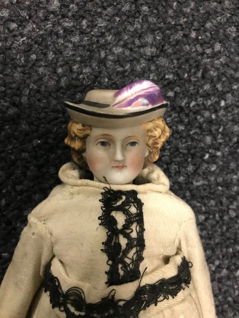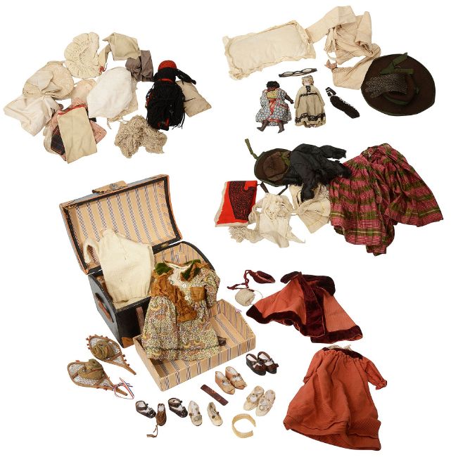 including: a dolls domed top trunk with carrying handles to sides, and striped interior, containing a number of dolls shoes, a pair of dolls snow shoes, a patterned dress, jumper, full length dress and petticoat; together with a small bisque headed doll, in cream coloured laced edged costume; a small doll in floral dress; a knitted type doll; wide brimmed hat; pair of gloves; spectacles; apron; red corded cape, dress and bonnet set, with velvet trim; muff; cushions; a scarf, jacket, skirt and bonnet set and a number of additional knitted and lace pieces (qty)
