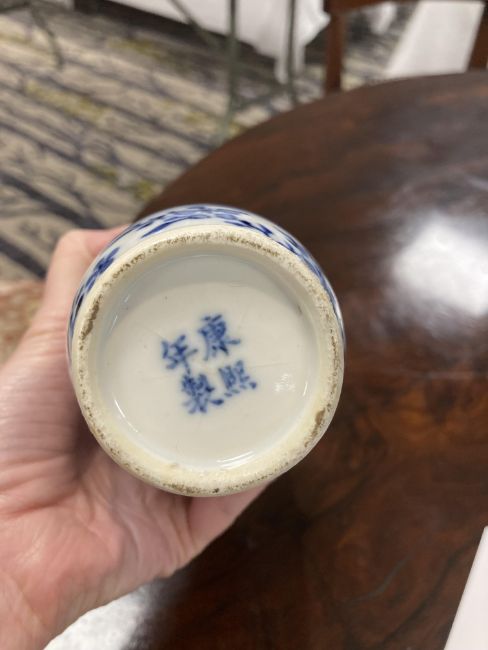 of shouldered tapering form, decorated in underglaze blue with all twelve animal Zodiac animals in a landscape, underglaze blue four character Kangxi mark