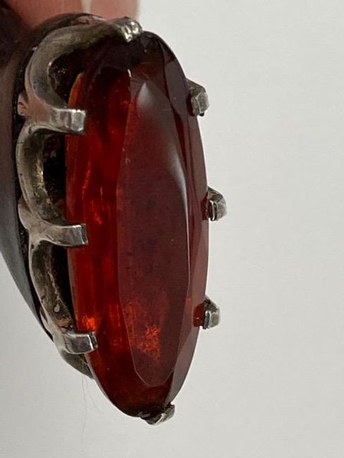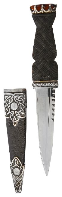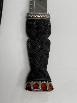 3 1/2 " stainless steel blade, basket weave carved horn grip handle, the pommel mounted with oval cut citrine in a coronet claw setting, the leather scabbard mounted with Celtic scrollwork mounts