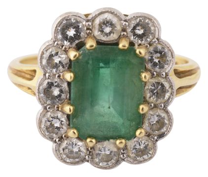 the rectangular cut-cornered emerald claw-set above a surround of twelve brilliant-cut diamonds to the tapering 18ct yellow gold shank, Birmingham hallmark