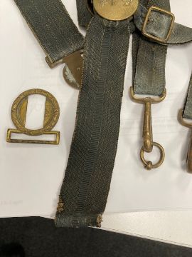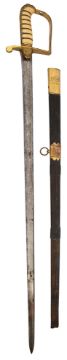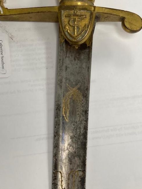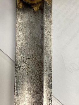 Condition:Steel with some areas of oxidation and light pitting. Generally dulled. Etched decoration clear. Gilt rubbed on hilt. Leather scabbard cracked, dry, scuffed and worn. Tip of scabbard present but detached. One hanging ring detached form scabbard but attached to belt clip. Two old repairs to leather. Gilt mounts rubbed and worn.