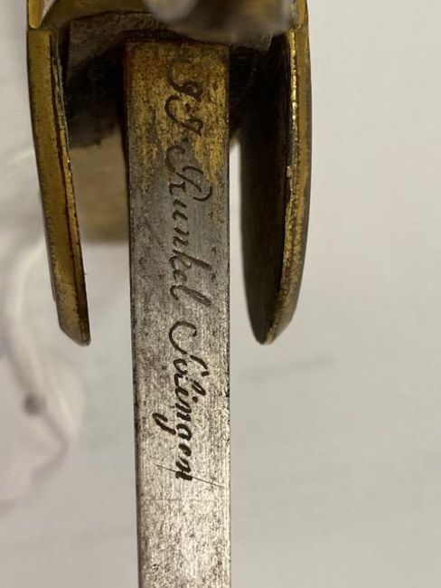 30.5" straight single fullered blade etched with crowned GR cypher, Royal Coat of arms foliage and a crested, stamped J J Runkel, Solingen
