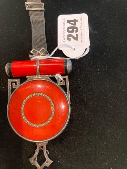 A 1920s French Art Deco silver and marcasite set red and black bakelite powder compact and lipstick holder