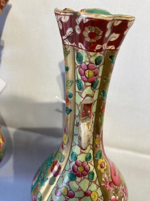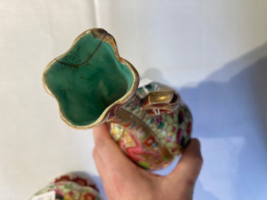 A collection of English ceramics, late 18th century and later, including; a large blue and white 'Willow' pattern serving dish, a Pearlware blue and white 'Willow' pattern meat platter, four late 18th century 'Conversation Pattern' blue and white transfer printed plates, of octagonal form, Spode 'Italian Pattern' side plate, a plate and two Minton floral patterned plates, two Miles Mason vases, both decorated with Chinoiserie dragon and butterfly motifs, pseudo Chinese marks to base, and a Royal Worcester Aesthetic Movement plant trough with elephants head handles, probably Kerr and Binns, decorated with oriental inspired motif (13)the first width 46.5cm Condition:Miles Mason vases not a pair. Smaller with loss to one handle, hairline to body. Stuck chip to rim with hairline. Gilt rubbed on both. Royal Worcester - star crack to side. Blue and White - Overall condition fair - good. Some with cracks and chips in accordance with age.