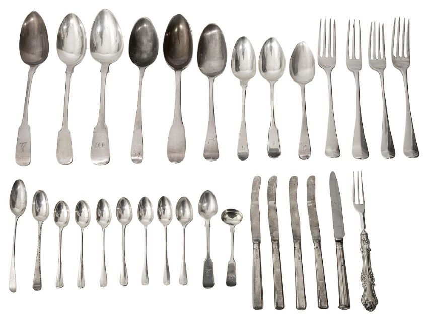 to include a George II Hanoverian pattern tablespoon, London, 1744, makers mark indistinct, crested, a provincial fiddle pattern tablespoon,Newcastle, 1794 by Thomas Watson, a Scottish William IV fiddle pattern tablespoon, Glasgow, 1831 by John Mitchell, an Irish fiddle pattern tablespoon, Dublin, 1830 by William Cummins, an 18th century continental fiddle pattern table spoon, probably French, four Old English table forks, a thread a drop dessert spoon, seven matched Hanoverian pattern coffee spoons, assorted silver handled tea knives, etc., (qty)