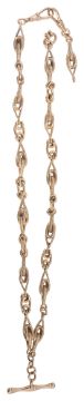 with alternating plain and engraved links and suspending a T bar, two swivel clasps stamped '9ct' and' 9KT'