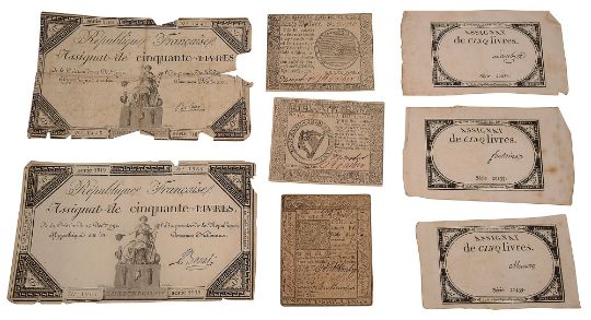 America: Twenty Shillings note, Delaware, 1st Jan 1776 by James Adams, Sixty Dollars Note and Eight dollar note, Philadelphia, Sept. 26th 1778 by Hall & Sellers. France, five assignats: 2 x cinquante livres dated 1792, no 1965 serie 2919 and no 1443 serie 5165 and 3 x assignat de cinq livres, serie 20439, 1793 (8)