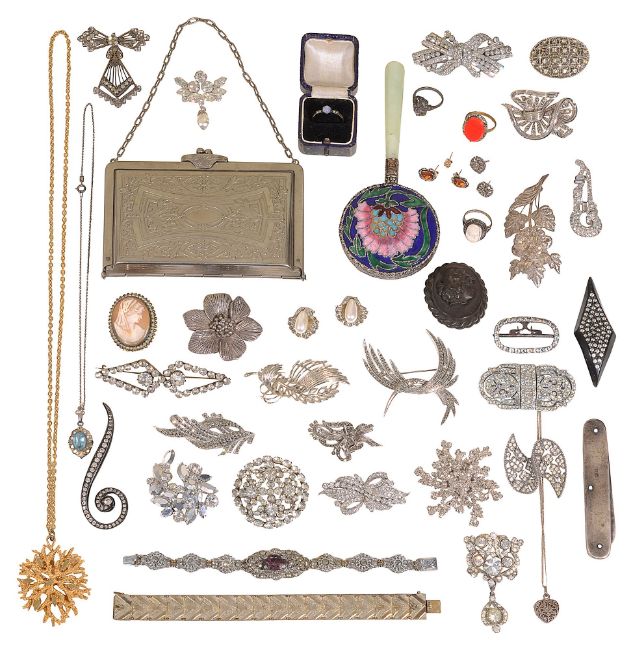to include 9ct and silver paste set ring, paste buckle, silver gilt textured panel bracelet, bois durci cameo brooch, an enamel decorated hand mirror with green hardstone handle, a plated purse , silver folding pocket knife, assorted brooches, etc., (qty)