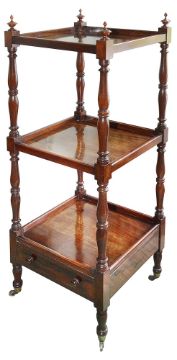 the turned finials above galleried shelves and a drawer, on turned legs with brass cappings and castors, height 126cm, width 41cm, depth 41cm,.Condition:In good condition overall, some minor heat damage to the top tier.