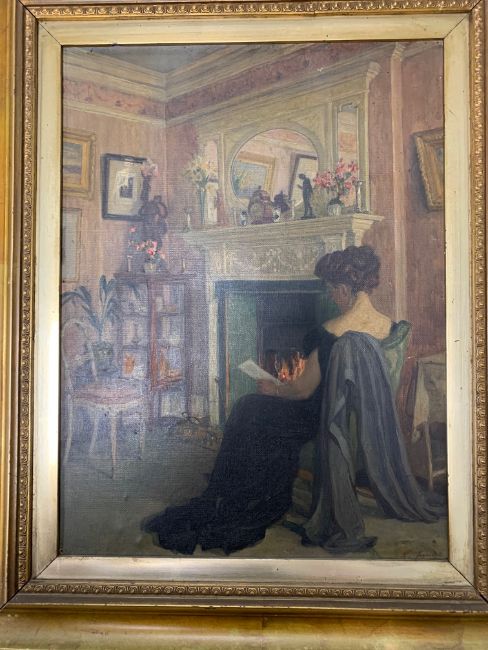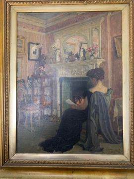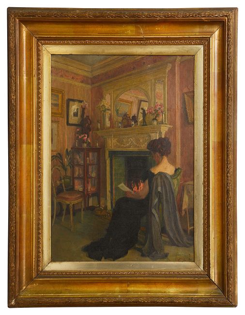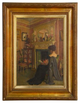 British School (early 20th century): 'An Interior Scene of a Lady Reading in front of a Fireplace',