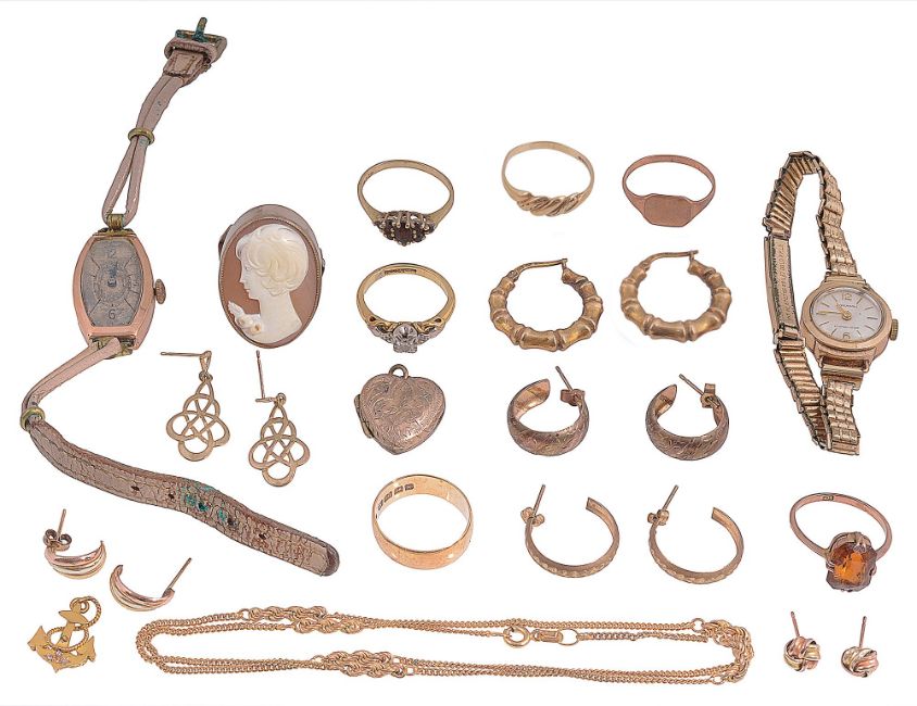 comprising a fine 9ct gold chain, 18ct gold wedding band, cameo dress ring, 9ct gold tonneau shaped wrist watch, four 9ct gold rings, a 10ct gold illusion set diamond ring, gold cased watch and several pairs of earrings (qty)