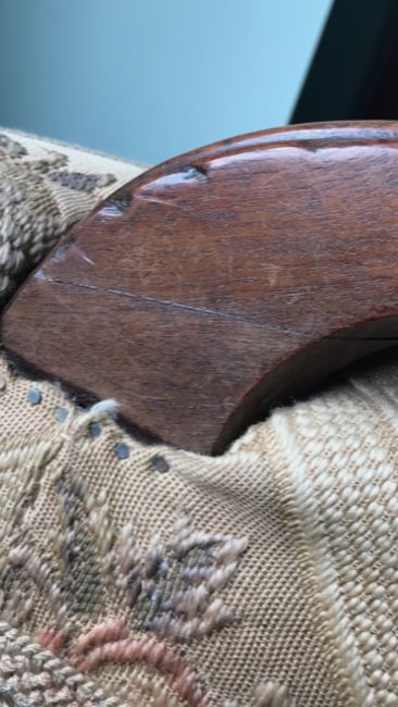 the shaped back above padded reeded downswept arms, on square moulded legs, restorations,.height 101cm, width 72cm, depth 80cm,.Condition:Three of the stretchers are later, one side stretcher is original. Both rear feet have spliced repairs. There is a repair to the right arm facing, no later timber involved. To the underside, the corner brackets are replaced. There are old wormholes and losses due to worm in places, see images. Legs formerly with castors. There is a crack to the front right leg, visible on the outside.