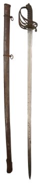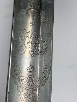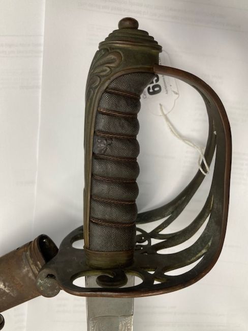 34 1/2" straight fullered blade, etched on both sides with crowned cypher, Ceylon Light Infantry and bearing owners initials J H de S, regulation hilt with wire bound shagreen grip, steel scabbard