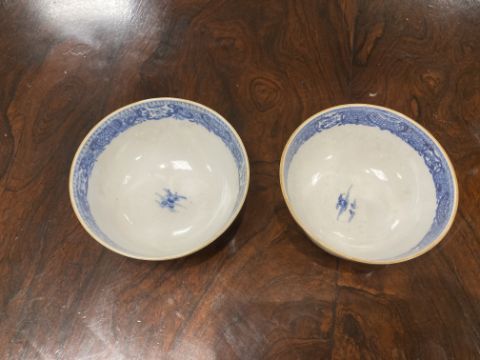 A Chinese 'clobbered' octagonal charger, together with a pair blue and white tea bowls,