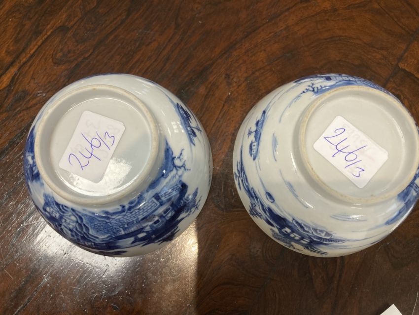 the charger blue and white with overpainting in green, red and gilt, shaped rim, with painted mark to base; the tea bowls, 18th century decorated with scenes of pagodas and figures, (3)