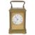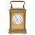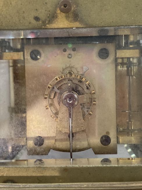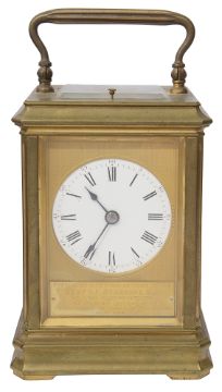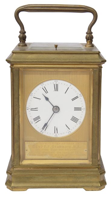 A large late 19th century French gilt brass cased repeating carriage clock white enamel dial with black Roman numerals, minute track, outer Arabic minutes and blued steel hands, eight two train movement with passing strike on a coiled gong, compensated balance, backplate numbered 8787, engine turned mask bearing presentation plaque 'Presented with other articles to the Revd F.F. Starbuck. M.A. by the Parishioners of the Parish Church of Deal. On his leaving the curacy of that parish. May 1881, four glass gorge case with inspection top in a fitted leather travel caseheight with handle upright. 22.5cm., case height 17cm.Condition:Winds ticks and runs however no guarantee can be offered as to the full working order of this clock. The repeat and striking function need servicing. Winding key present. SOme rubbing to oxidation to case. Travel case with loss and scuffing to leather, particularly to top. The case has a section of leather detatched from the top  Starbuck family and thence by descent