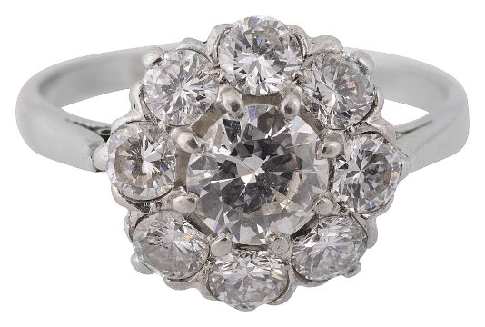A diamond cluster ringset throughout with brilliant-cut diamonds, the plain tapering shank stamped 'PLAT' ring size P, 4.4gCondition: Overall condition good/very good.  Sits well on finger, not too high. Shank  cut through at base Diamonds:  Bright stones. Estimated total spread weight approx 1.80-2.00cts , H-J colour and SI/PK clarity (due to most stones have a small dark inclusion not visible to the naked eye; centre stone also has a small chip to girdle)