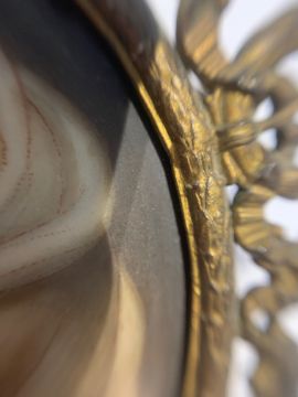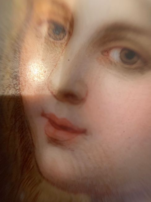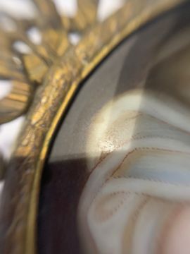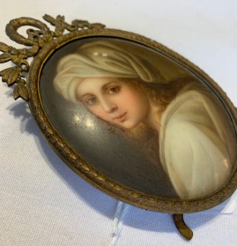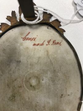 depicting a young girl, of oval form and within a gilt metal easel frame with wreath cresting, rear with a stamp 'ROMA' and incorporating the figure of a wolf and Romulus and Remus, signed 'G Reni', other writing to rear indistinct