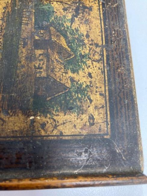 An early 19th century Tunbridge ware 'The Millers Tomb' travelling mirror and a white wood box
