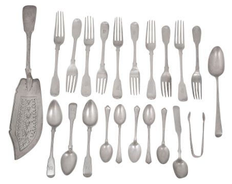 An early Victorian silver fiddle pattern fish slice, ten matched George IV and later fiddle pattern dessert forks and other silver