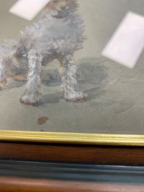 Condition:Unexamined out of frame - apparent 2cm tear from lower margin to dogs front paw, horizontal 1.5cm tear from centre right edge