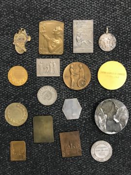 to include an Art Deco Perseus and Andromeda medal by Raymond Delamarre, a leather cased musicial competition plaquette by Genieve Granger, Ceramique prize plaquette by G. Prud'home, a Gallia medal by Albert Herbemont, Le Soir plaquette by Theunis, a silvered Societe Des Artistes Francaise Architecture - Salon de 1932- by Daniel Dupuis, a bronze Orpheus medal by L. Coudray, a silvered Musique plaquette