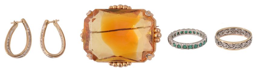 A pair of diamond-set earrings, two eternity rings and a costume brooch