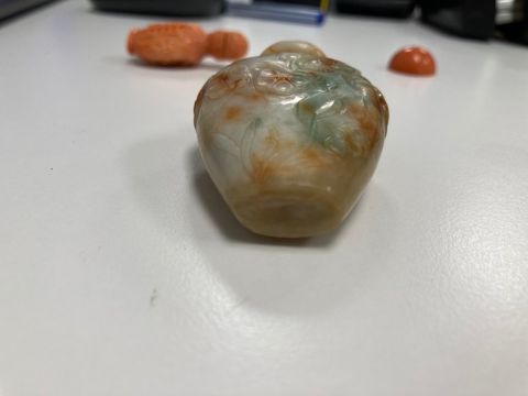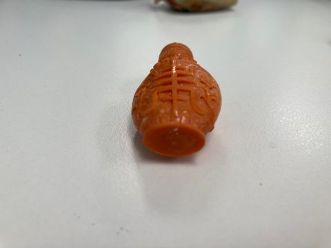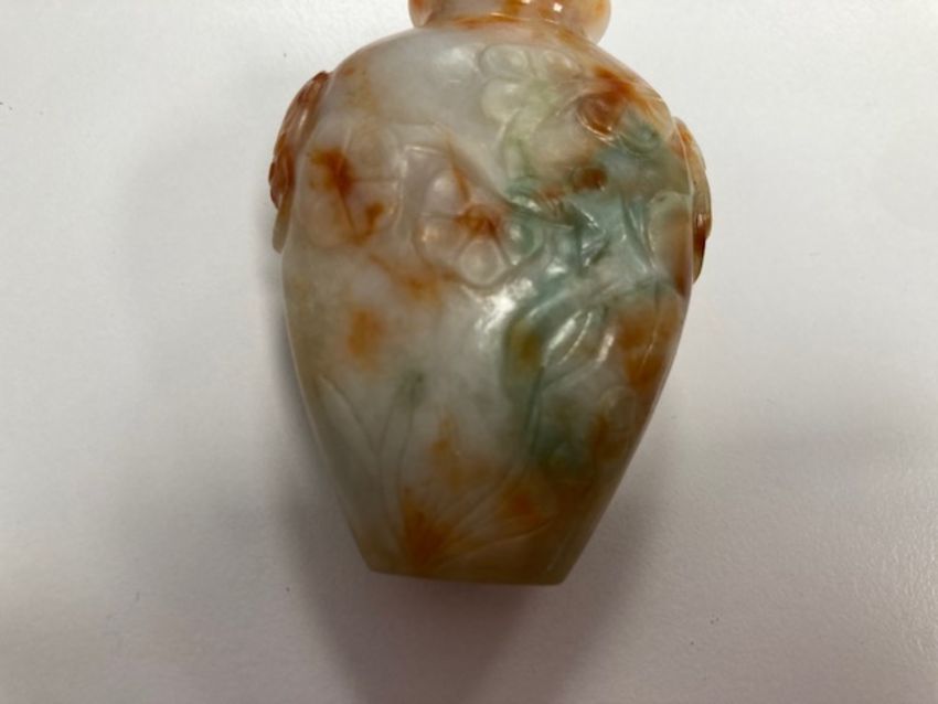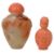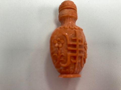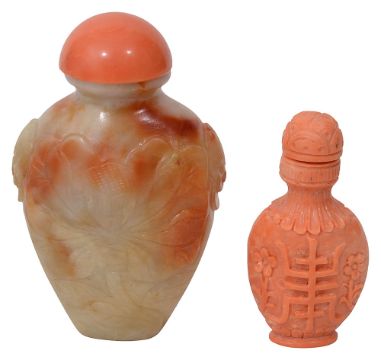 A Chinese carved coral snuff bottle and stopper and a russet celadon jade snuff bottle and stopper