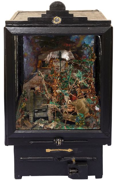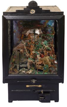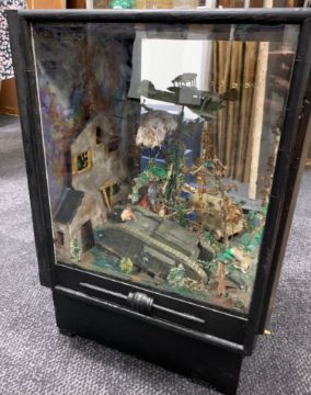 within black painted case with a glazed sides and front, with front crank handle, the diorama depicting a tank within a landscape, with bi-plane flying overhead.height 57.75cm, depth 32.5cm, width 30.5cm.Condition:In worn condition - movement running slowly.