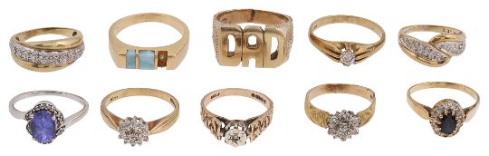 Ten assorted rings: eight with diamond-set detail, of which seven with 9ct hallmarked shanks, the eighth with a rubbed mark; a heavy 9ct yellow gold bark textured ring spelling DAD; and a turquoise-set ring, the shank stamped '14K'