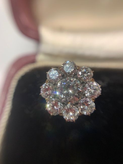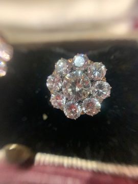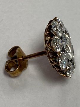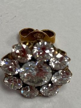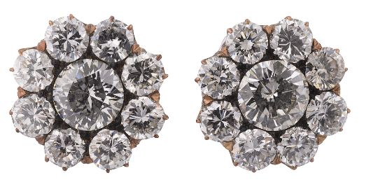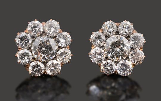 A pair of diamond-set earrings, each set with nine brilliant-cut diamonds in flower setting, fitted casediameter 1.2cm, combined gross weight 2.4gmCondition: Overall condition good/very good. Bright stones.  Centre diamond approx 5.30mm x 5.1 mm (culet inaccessible)  with a total estimated spread weight of approx 3 cts.    Good clarity (mostly VS, some possibly SI) and colour (H-J, six fluoresce) .   Well set:  appears to be yellow gold but no hallmarks  nor stamped with any  indication of standard.