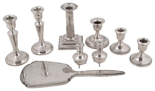 A collection of silver to include assorted dwarf candlesticks with weighted bases, a pair of George V pepper casters and a hand mirror