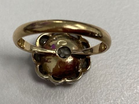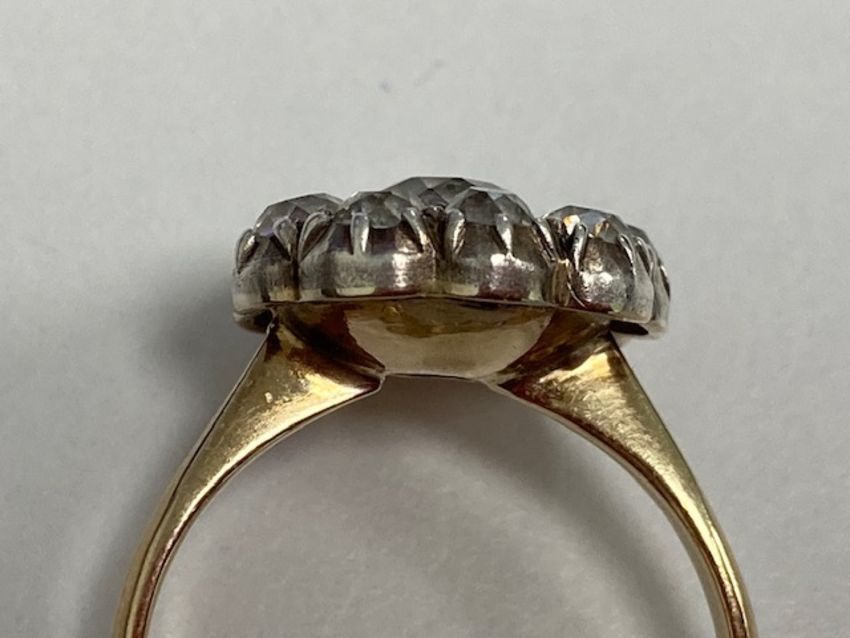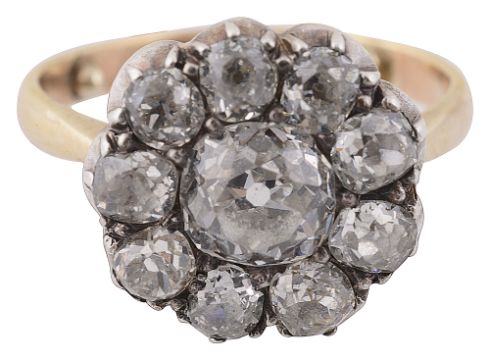 A diamond-set cluster ring, set with cushion-shaped old brilliant-cut diamonds, partially closed-back silver and yellow gold setting to the plain tapering shank, ring size H (with pips), cluster diameter 1.3cm, 3.0gCondition: Overall condition good - though shank possibly later.Diamonds bright with reasonable colour and clarity (a couple with small inclusions)  .  Set in cut-down collets. Total estimated spread weight approx 1.50-1.80cts ( girdles concealed by setting) Sits nicely flat on the finger.