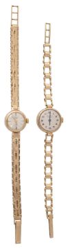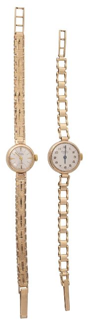 first silvered dial with with Arbaic numerals and minute markers, 17 jewel manual wind movement, on a 9ct gold articulated bracelet with fold over clasp, (2)