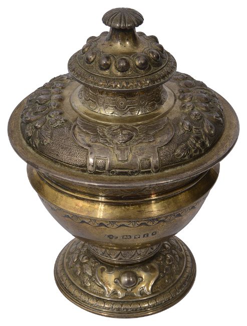 of circular tapering form the flared rim engraved with a landscape border, on a domed foot embossed with acorns and cartouche shaped reserves with acanthus borders, the domed cover embossed with winged masks fruit and flowers