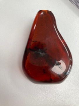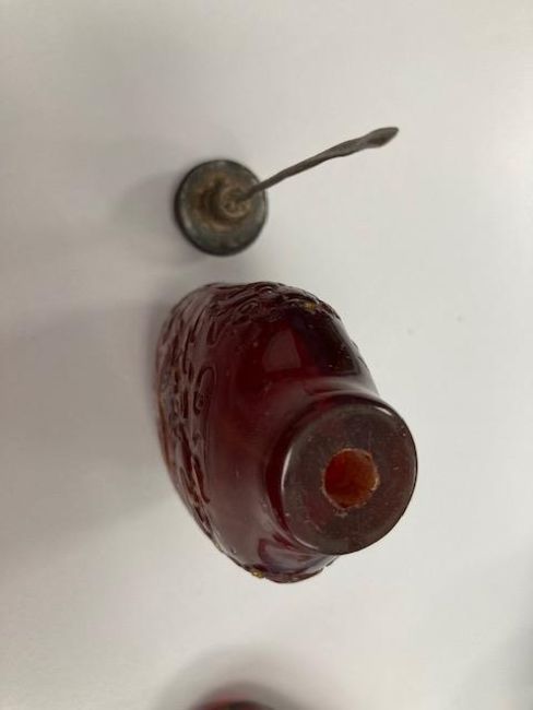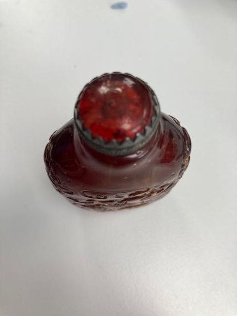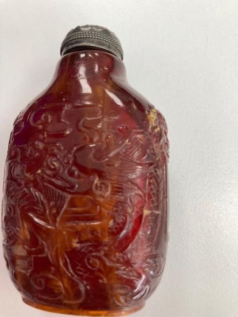 Two Chinese amber snuff bottles and stoppersQing/Republican first relief carved with lion mask ring handles, phonenix and dragon, silver mounted agate stopper, second of pear shaped pebble form,silver mounted jade stopper, (2)first height 7.5 cm.,Weight 75gCondition:The first has occasional small flea bite chips and impact marks.The second example with a small loss /chip at mouth and short stable hairline travelling approx. 1.5 cm down one side.
