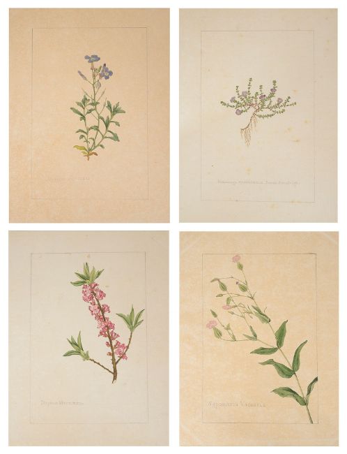 'Saponaria Vaccaria', 'Saxiafraga oppositfolia Purple Saxifrage', 'Daphne Mezereon' and 'Alyssum deltoides', watercolour and pencil, (4)