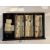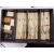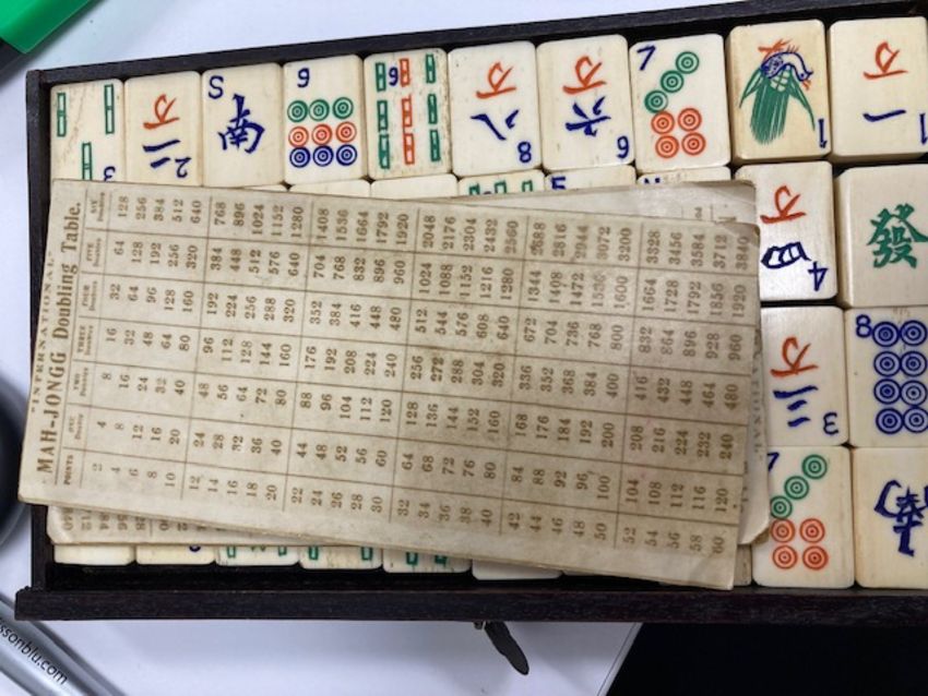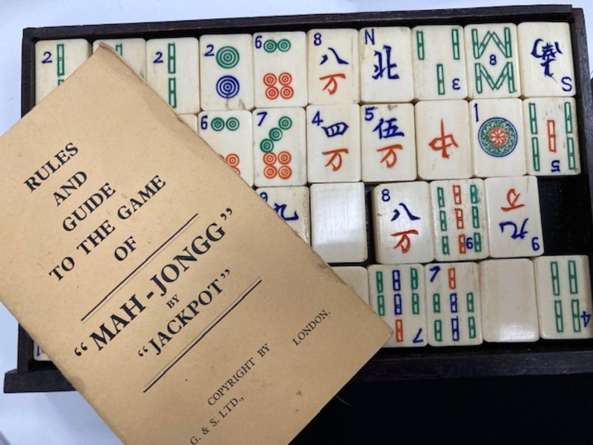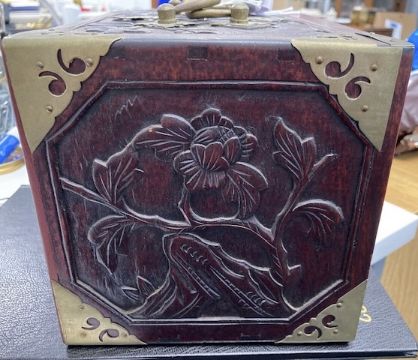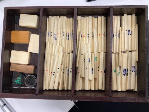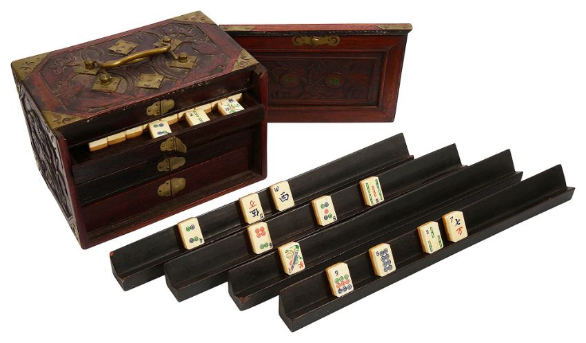 the case with foliate relief carved sides sliding front and cut brass mounts and carrying handles, bears Pung Wo paper trade label, interior with five drawers containing bone and bamboo counters and sticks with instruction booklet by Jackpot and four hardwood tile rests, (5)