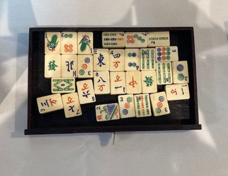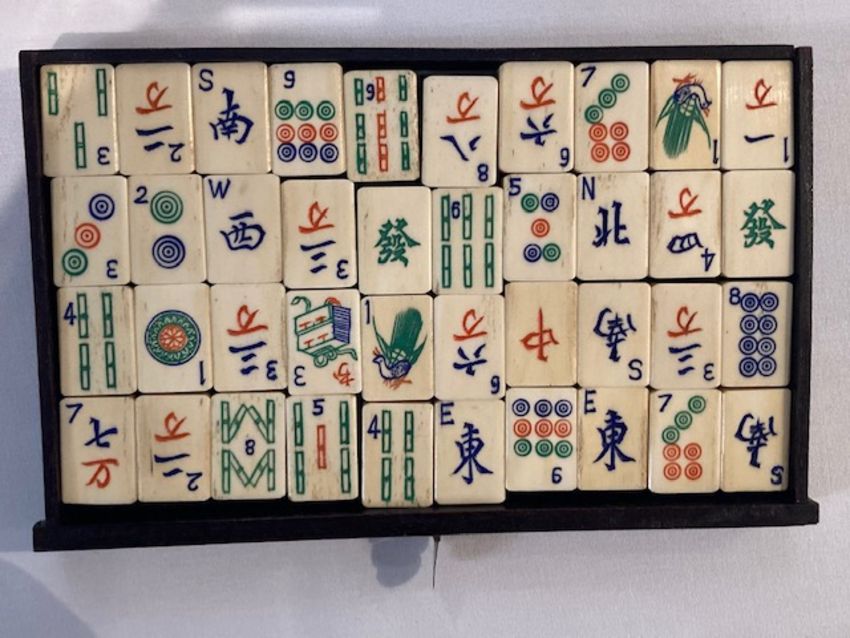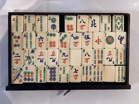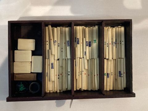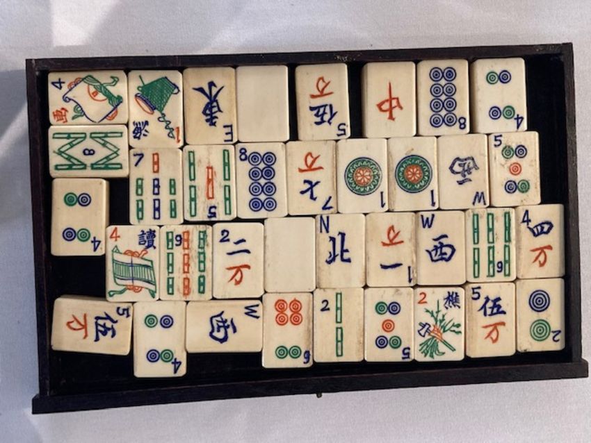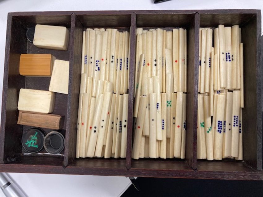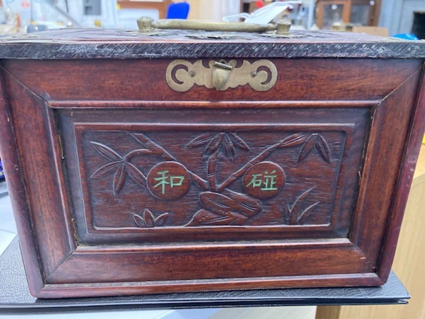 An early 20th century Chinese carved rosewood cased Pung Wo mahjong set