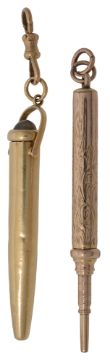 the first hallmarked 9ct, the body with chased scrolled decoration engraved 'Emmie' and suspension loop, the second extending pencil with cabouchon terminal and French control marks, with fitted tapered outer gold case with suspension loop (2)