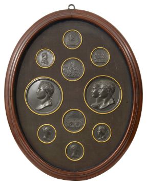 Battle of Marengo; King of Italy; Storming of the Bastille; First Consul; Portrait of Napoleon; Marriage of Emperor Napoleon to Marie Louis; Arrival of the King in Paris; Bust of Marie Louise; Napoleon I portrait and Bust of Josephine, each within gilt coloured mount framed together within oval display